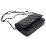 Details: Black Quilted Lambskin Leather / Silver Tone Hardware / Chain Link And Leather Shoulder Strap / Exterior Pocket At Back / Burgundy Grosgrain And Leather Interior / Six Card Slot At Interior / Three Interior Pockets / Two Zip Pockets / Snap Closure At Front