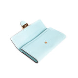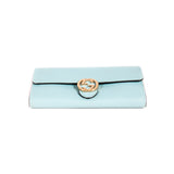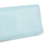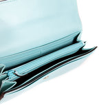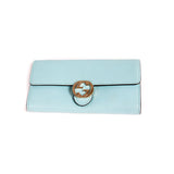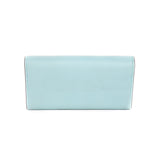 Details: Blue Matt Leather / Light Gold-Tone Hardware / Logo at Front / Dual Compartment / Three Bill-Compartment / Zipper Pocket at Center / 12-Card Slots / Push Button Closure at Front