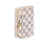Details: White Damier Azur Coated Canvas / French Wallet Purse / Brass Gold Tone Hardware / Four Interior Card Slots / Dual Slit Pockets / Single Interior Bill Compartment / Coin Compartment Featuring Kiss-Lock Closure and Snap Button Closure.