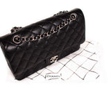 Details: Black Caviar Leather / Silver-Tone Hardware / Chain-Link and Leather Shoulder Strap / Burgundy Leather Lining / Dual Compartments with Two Flat Pockets at Inside / Dual Flap, One with Push-Button and Another with Turn Lock Closure