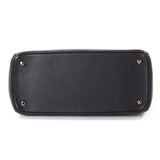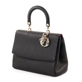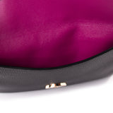 Details: Black Pebbled Calf Leather / Gold Tone Hardware / Single Rolled Handle / Detachable Adjustable Shoulder Strap / Logo Charm at Front / Purple Leather Lining / Large Compartment / Dual Slit Pocket at Interior / Slit Pocket Under the Flap / Push Lock Closure at Front Flap