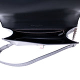Details: Silver Metallic Leather / Silver-Tone Hardware / Adjustable Shoulder Strap / Black Leather Lining at Interior / One Zipper Pocket and One Slit Pocket / Push-Lock Closure at Front Flap