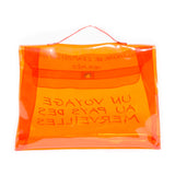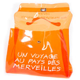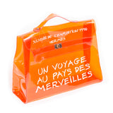 Details: Orange Vinyl / Gold-Tone Hardware / Turnlock Closure / White Screen Printed And Contrast Stitching "Un Voyage Au Pays Des Merveilles" Translation " A Trip To Wonderland" / Single Handle Drop
