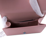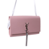 Details: Pale Pink Calf Leather / Silver-Tone Hardware / Logo and Tassel Endowment at Front / Chain Shoulder Strap / Single Compartment / Suede Lining / Flat Pocket / Magnetic Snap Closure at Front