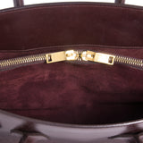 Details: Plum Leather / Small Size / Gold-Tone Hardware / Detachable Shoulder Strap / Dual Rolled Top Handles / Plum Suede Interior Lining / Three Interior Compartments / One Compartment With Zip Closure One Top / One Compartment With Two Pockets At Interior Wall / One Compartment With Zip Closure At Interior Wall