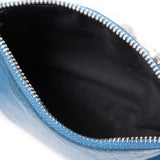 Details: Blue Leather / Silver Hardware / Exterior Zip Pocket At Front / Single Compartment / Black Fabric Interior Lining / Zip Closure At Top