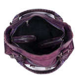 Details: Purple Agneaux Leather / Silver-Tone Hardware / Dual Rolled Handles / Detachable Shoulder Strap / Zipper Pocket at Front Face / Studs Embellishments Throughout the Exterior Front / Black Fabric Lining / One Zip Pocket at Interior / Zipper Closure at Top