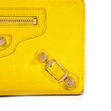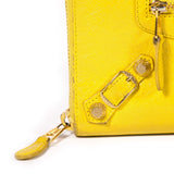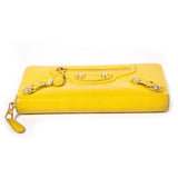 Details: Yellow Leather / Gold-Tone Hardware / Single Exterior Small Pocket At Front Face / Buckle And Stud Embellishments At Front / Yellow Leather Lining With Black Fabric At Interior / Twelve Card Slots / Four Compartments, One With Zip Closure / Zip Closure Around
