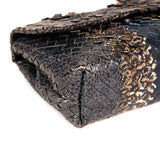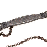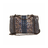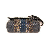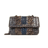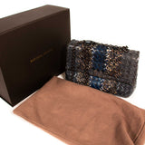 Details: Grey, Brown and Blue Intrecciato Woven Snake Skin Leather / Black Metal Hardware / Chain Link Strap with Leather Pad / Flap Top With Snap Closure / Interior Suede Lining / Two Large Inside Compartments and One Small Inside Compartment for Cards