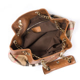 Details: Beige And Multicolor Coated Canvas With Brown Leather / Gold Tone Hardware / Dual Chain-Link Shoulder Strap With Brown Leather Handle / Brown Leather Trim / Brown Woven Interior Lining / Single Compartment With Dual Slit Pockets And Single Zip Pocket / Logo Engraved Pins Embellishment Throughout