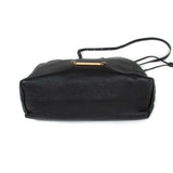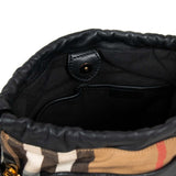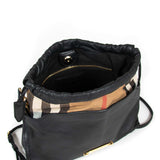 Details: Black Leather / Gold-Tone Hardware / Detachable Adjustable Leather Strap / Vintage Check Canvas Accent / One Compartments / Black Fabric Interior Lining / 2 Slit Pockets / 1 Zipper Pocket / Drawstring Closure at Sides and Snap Closure at Top
