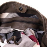 Details: Dark Chocolate Perforated Suede / Black Hardware / Single Rolled Handle / Brown Leather Trim / Super Nova Check Canvas Lining / Three Interior Pockets, One With Zip Closure / Magnetic Snap Closure at Top