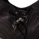 Details: Black Embossed Leather / Black-Metal Hardware / Braided Leather Drawstring / Panther Adornment at Front Face / Single Flat Handle / Tan and Brown Printed Suede at Interior / Two Flat Pockets and One Zip Pocket / Magnetic Snap Closure