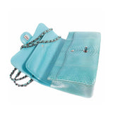Details: Light Green Python Leather / Silver-Tone Hardware / Chain-Link Leather Shoulder Strap / Leather Lining / Dual Compartments with Two Flat and Zip Pockets / Double Flap at Front with Turn-Lock Closure