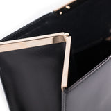 Details: Black Smooth Calfskin Leather / Gold-Tone Hardware / Rectangular Box Shape / Metal Top / Black Leather Lining At Interior / Single Compartment / Single Slit Pocket / Push Lock Closure At Top