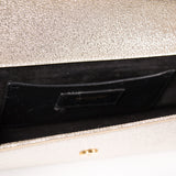 Details: Silver Metallic Leather / Gold-Tone Hardware / YSL Logo Adornment At Front In Gold-Tone / Single Compartment / Black Suede At Interior / Single Slit Pocket At Interior Wall / Flap Closure At Front With Magnetic Snap Closure