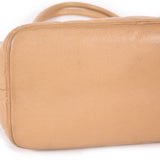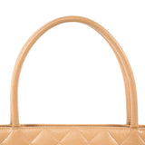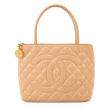 Details: Tan Quilted Caviar Leather / Gold Tone Hardware / Dual Rolled Handles / Exterior Flat Pocket At Back / Tonal Stitched CC Logo Embellishment At Front / Tonal Leather Interior Lining / Dual Pockets At Interior, One With Zip Closure / Zip Closure At Top