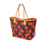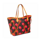 Details: Brown Monogram Canvas / Dual Flat Handles / Brass Hardware / Tan Leather Trim / Pink and Rose Circle Prints at Front and Back with Orange Branches / Single Compartment with Pink Canvas Lining / Zipper Pocket at Inside / Lobster Lock Closure