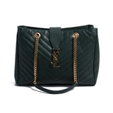 Details: Green Matelassé Leather / Gold-Tone Hardware / Dual Leather and Chain Shoulder Straps / Studs at Base / Black Fabric Interior Lining / Three Compartments, one with Zipper Closure / Magnetic Snap Closure at Front