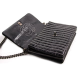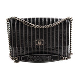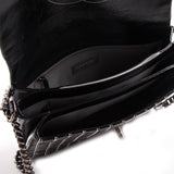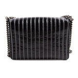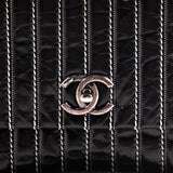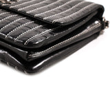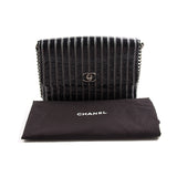 Details: Black Patent Leather / Antiqued Silver Hardware / White Vertical Stitching Pattern / Dual Chain Shoulder Strap With Black Leather Pad / Grey Fabric Interior Lining / Three Compartments / Zip Closure at Interior Wall / CC Turn Lock Closure at Front Flap