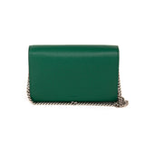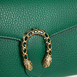 Details: Green Structured Leather / Antique Hardware / Crystal Embellishment at Tiger Head Front / Detachable Chain Strap / Fabric Lining / 16 Card Slots / 2 Bill Compartments / Three Interior Compartments / Zip Coin Pocket / Snap Closure