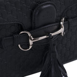 Details: Black Guccissima Leather / Gold Tone Hardware / Shoulder Strap with Chain Link Accent and Leather Pad / Natural Canvas Interior Lining / Single Slit Pocket at Interior Wall / Fold-in Flap Closure at Front / Horse-bit and Tassel Embellishments at Front