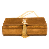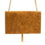 Details: Ocher Brown Suede / Gold Tone Hardware / Brown Leather Trim / Single Shoulder Strap With Chain-Link Accent / Gold-Tone Logo And Tassel Embellishments At Front Face / Brown Leather Interior / Single Slit Pocket At Wall / Flap With Magnetic Snap Closure At Front