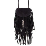 Details: Black Suede With Fringes / Silver Tone Hardware / Single Narrow Shoulder Strap / Fringes At Exterior / Logo Charm Accent At Front / Interior Suede Lining / Single Pocket / Magnetic Snap Closure At Front Flap