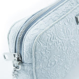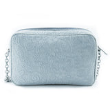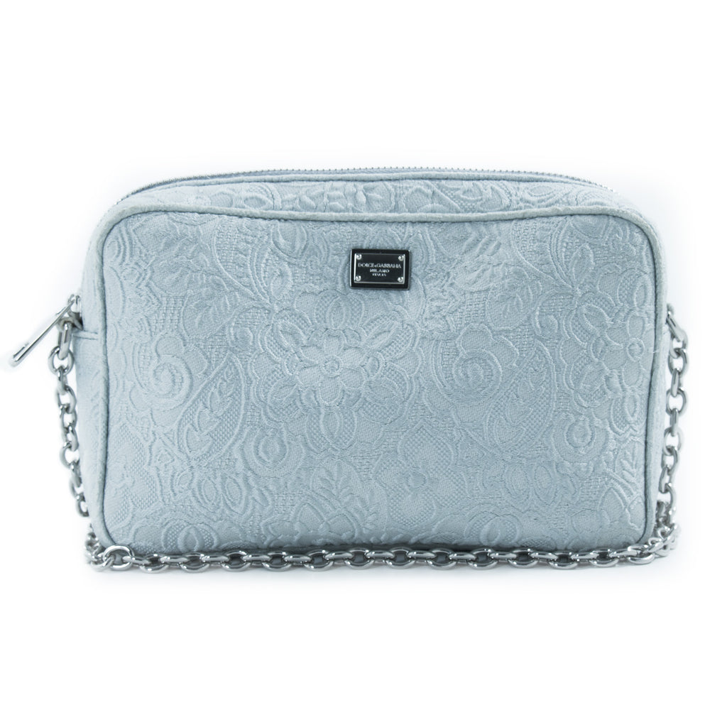 Details: Light Blue Fabric / Silver-Tone Hardware / Metal Plate Logo at Front / Long Chain Strap / Grey Satin Lining with Leopard Prints Flat Pocket / Zipper Pocket at Inside / Zipper Closure at Top