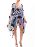 Details: Heer, Flowy Short Dress / Tunic Top / Deep V Neck Line / Mid Thigh Length / Handkerchief Type Hemline / Long Kimon-Type Sleeves That Are Cut Open From The Tip Of The Hand Up To The Below / Geometric Multi-Colored Prints With Shades Of Blue Purple Black And Grey