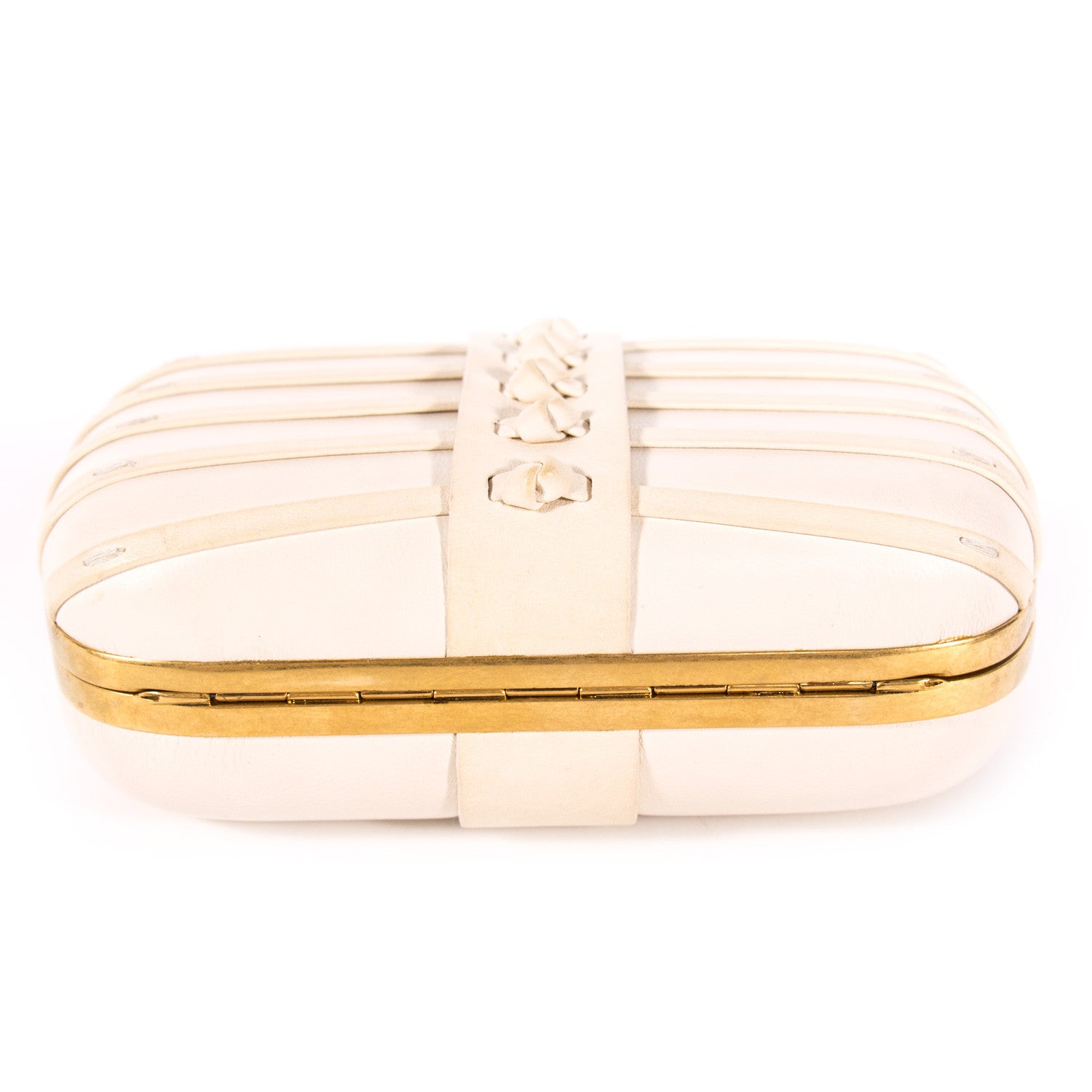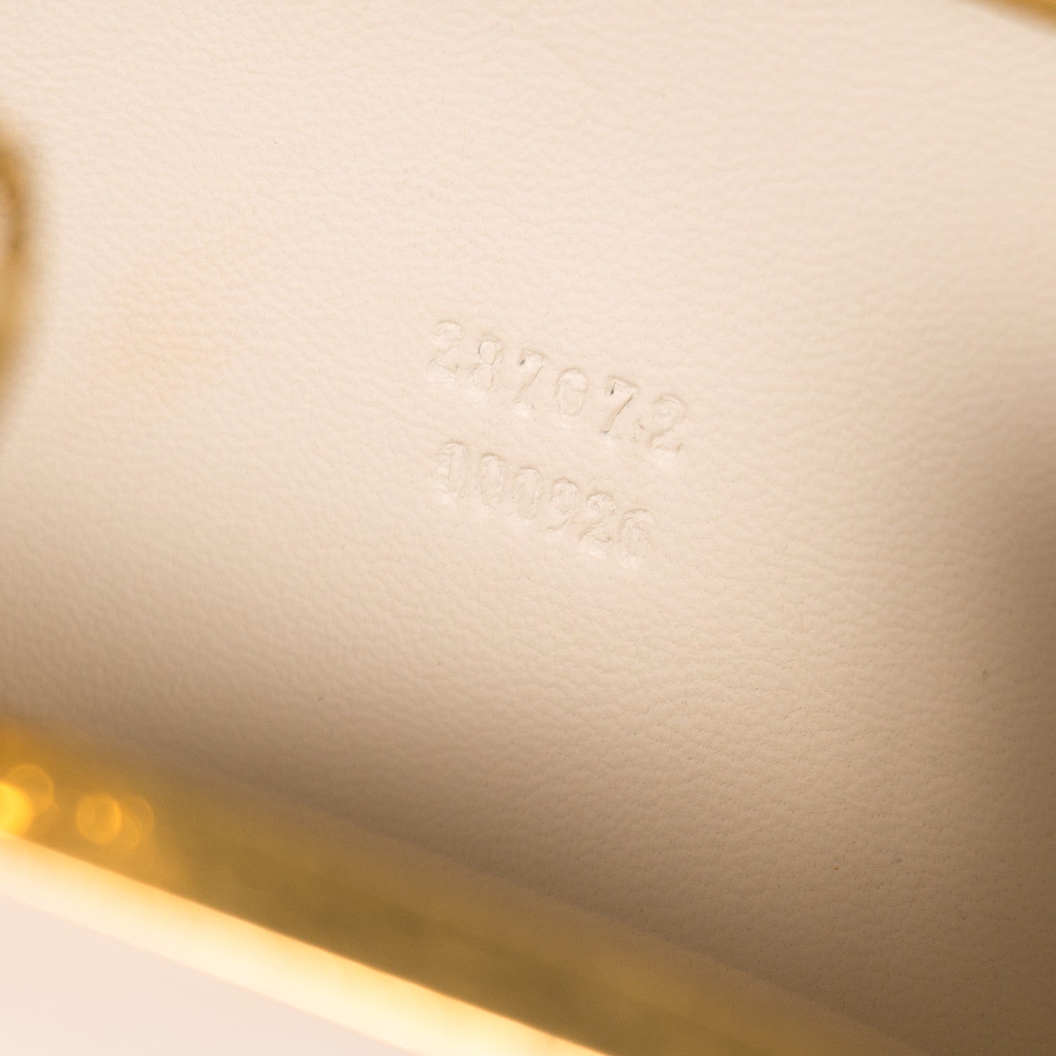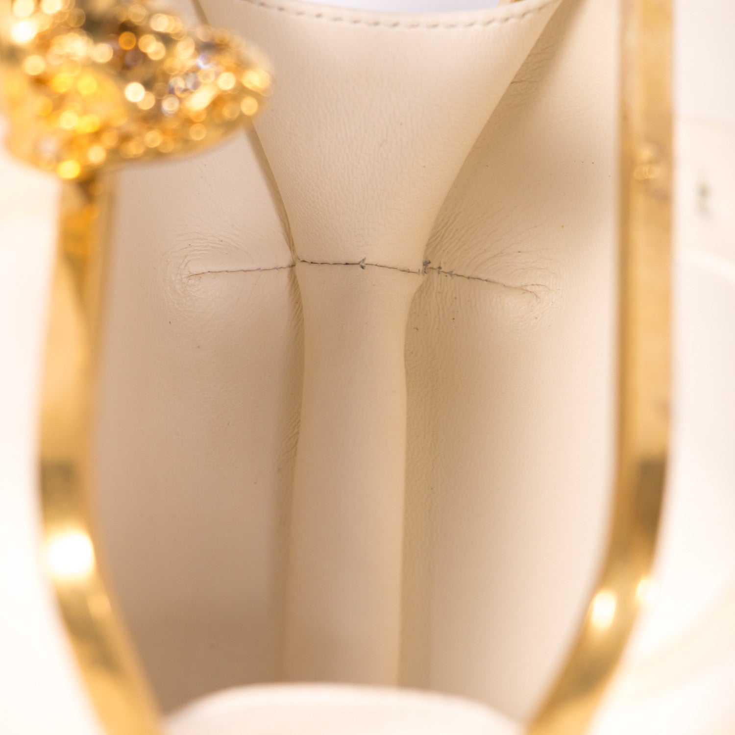Details: Beige Lambskin Leather / Gold Tone Hardware / Gold Jeweled Skull Switch Lock With Gold Pearl Eyes / Interior Leather / Embossed Logo At Inside