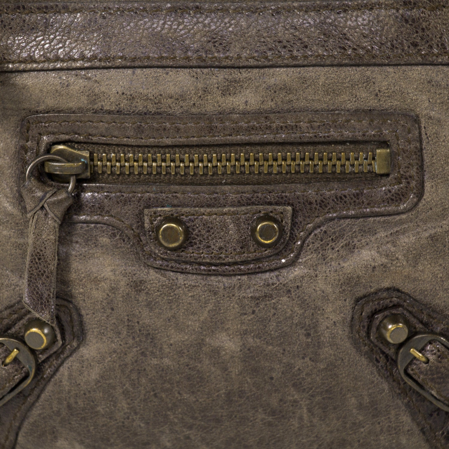 Details: Grey Leather / Brass Hardware / Exterior Zip Pocket At Front / Single Compartment / Black Fabric Interior Lining / Zip Closure At Top
