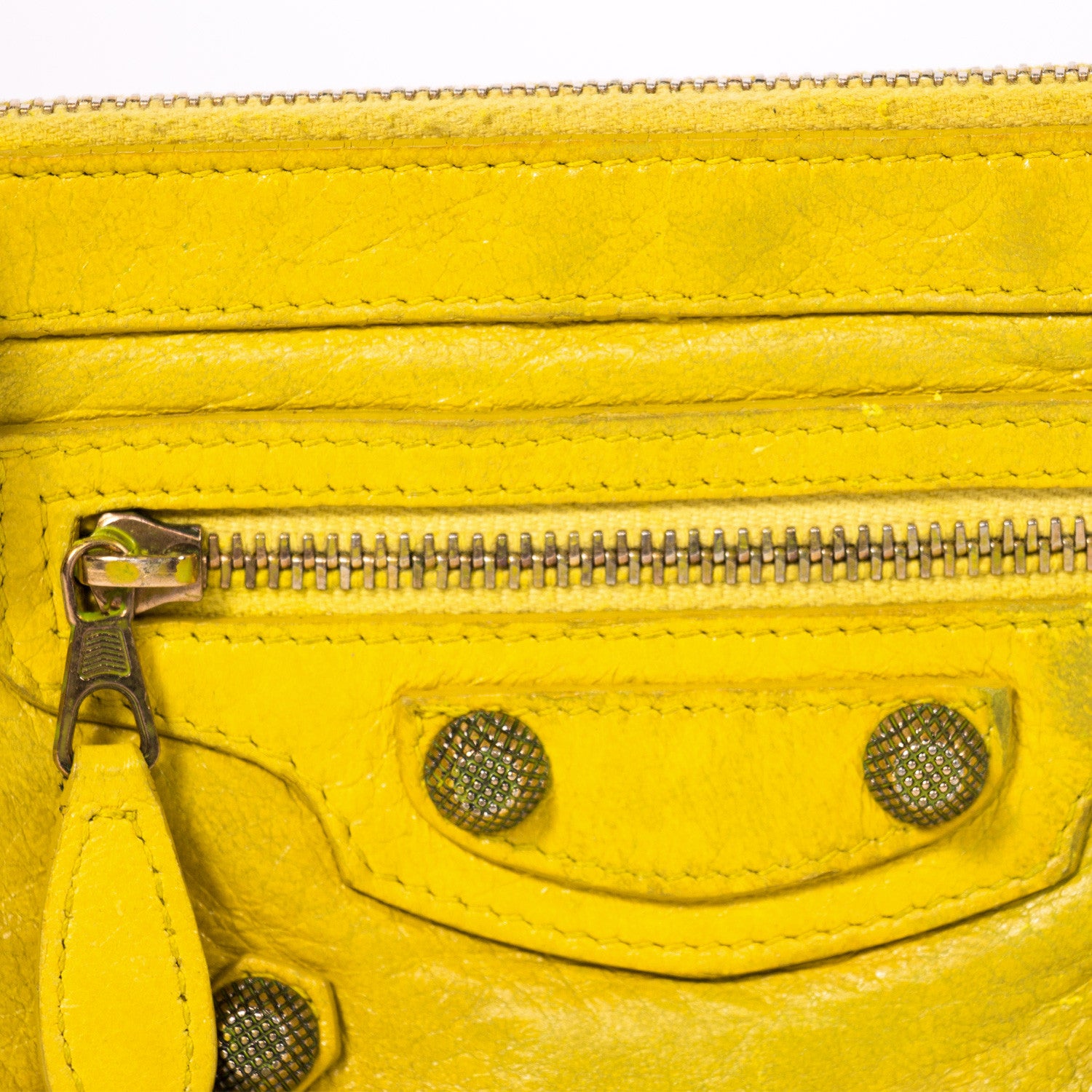 Details: Yellow Leather / Brass Hardware / Exterior Zip Pocket At Front / Single Compartment / Black Fabric Interior Lining / Zip Closure At Top