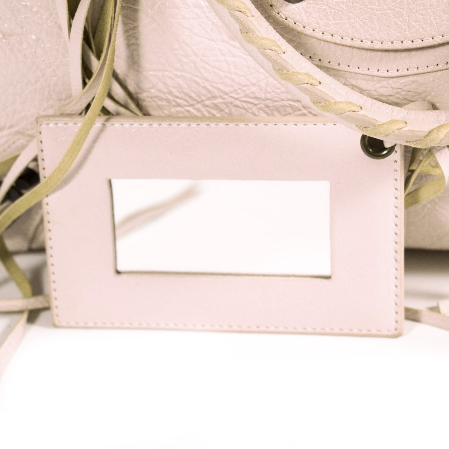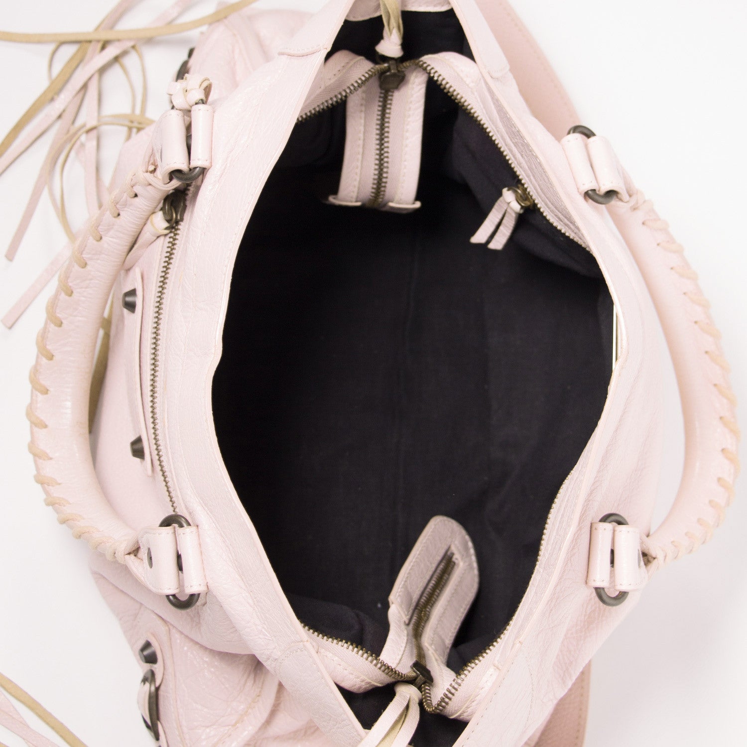 Details: Rose Pink Arena Leather / Antiqued Brass-Tone Hardware / Whipstitch Accent / Single Zip Pocket At Exterior / Stud And Buckle Adornments At Front / Dual Whipstitched Rolled Handles / Single Detachable Shoulder Strap / Black Woven Interior Lining / Dual Slit Pockets And Single Zip Pocket At Interior / Zip Closure At Top
