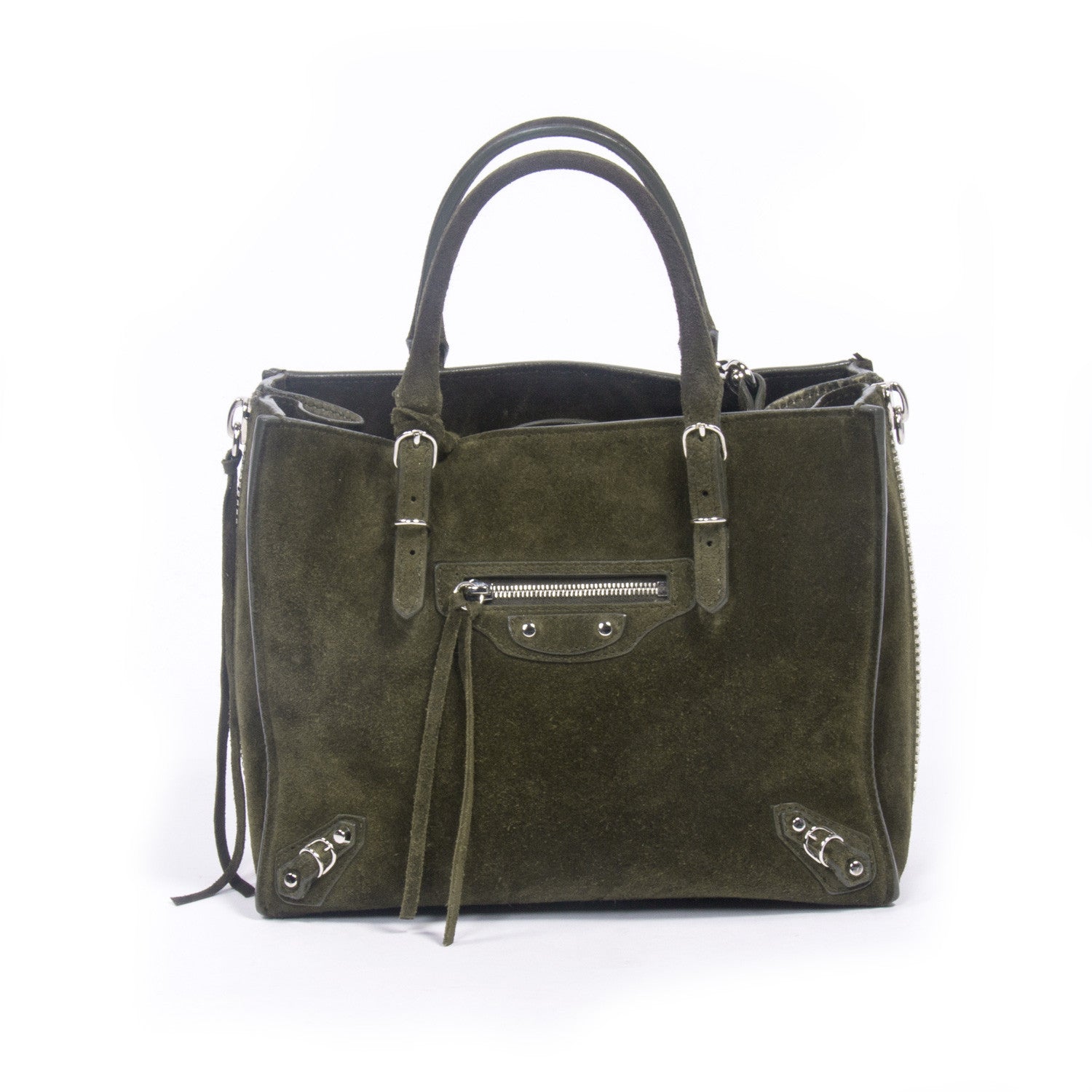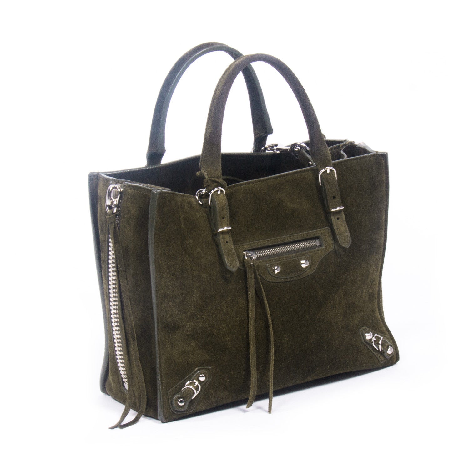 Details: Vert Olive Suede Tote / Silver-Tone Hardware / Adjustable Removable Shoulder Strap / Buckled Dual Rolled Handles / Single Pocket at Exterior With Zip Closure / Stud And Buckle Embellishments at Front / Dual Zip Expansions at Sides / Vert Olive Suede Inside / Black Leather Interior Base / Single Slit Pocket at Interior Wall and Open Top
