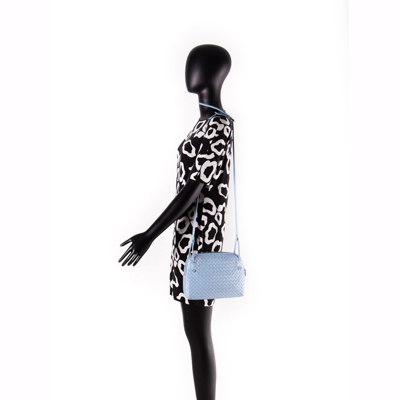 Details: Sky Blue Intrecciato Leather / Black Metal Hardware / Long Adjustable Shoulder Strap / Brown Suede Lining / Zipper and Flat Pocket at Interior / Dual-Way Zipper Closure at Top