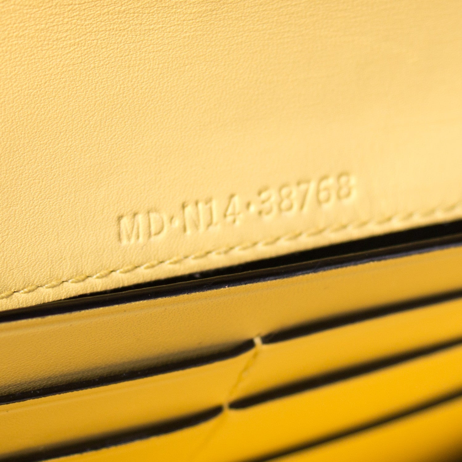 Details: Yellow Calf Leather / Brass Light Gold-Tone Hardware / Yellow Leather Lining / Three Compartments One With Zip Closure / One Flat Pockets / Ten Card Slots / Flap Closure / Serpenti Head Stud Closure in Black and White Enamel with Eyes Green Malachite