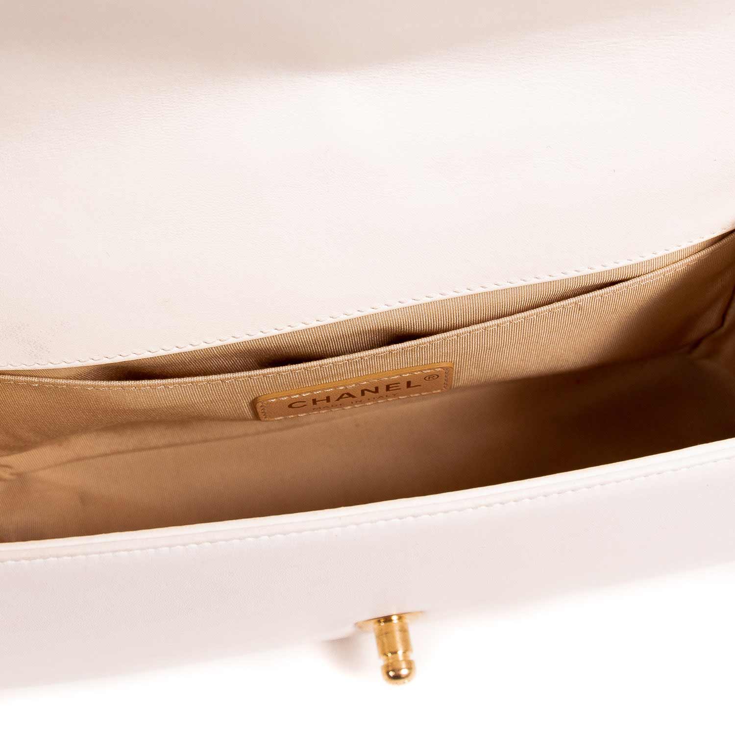Description: Ivory White Calf Leather / Gold Brushed Hardware / Chain-Link and Leather Shoulder Strap / Single Compartment / Beige Fabric Lining / Single Slit Pocket at Inside / S-Lock Closure at Front Flap / Embellishment Throughout the Front and Back