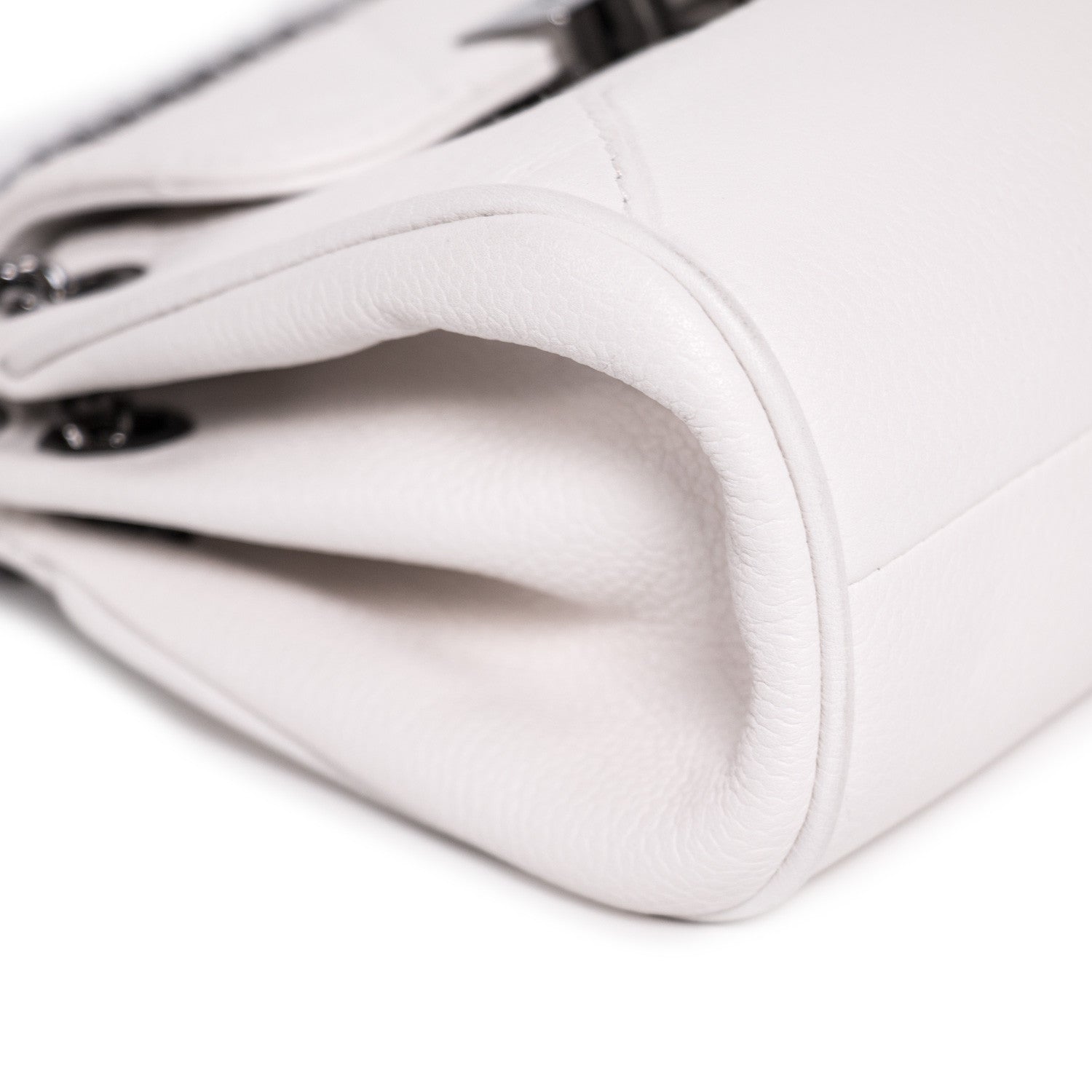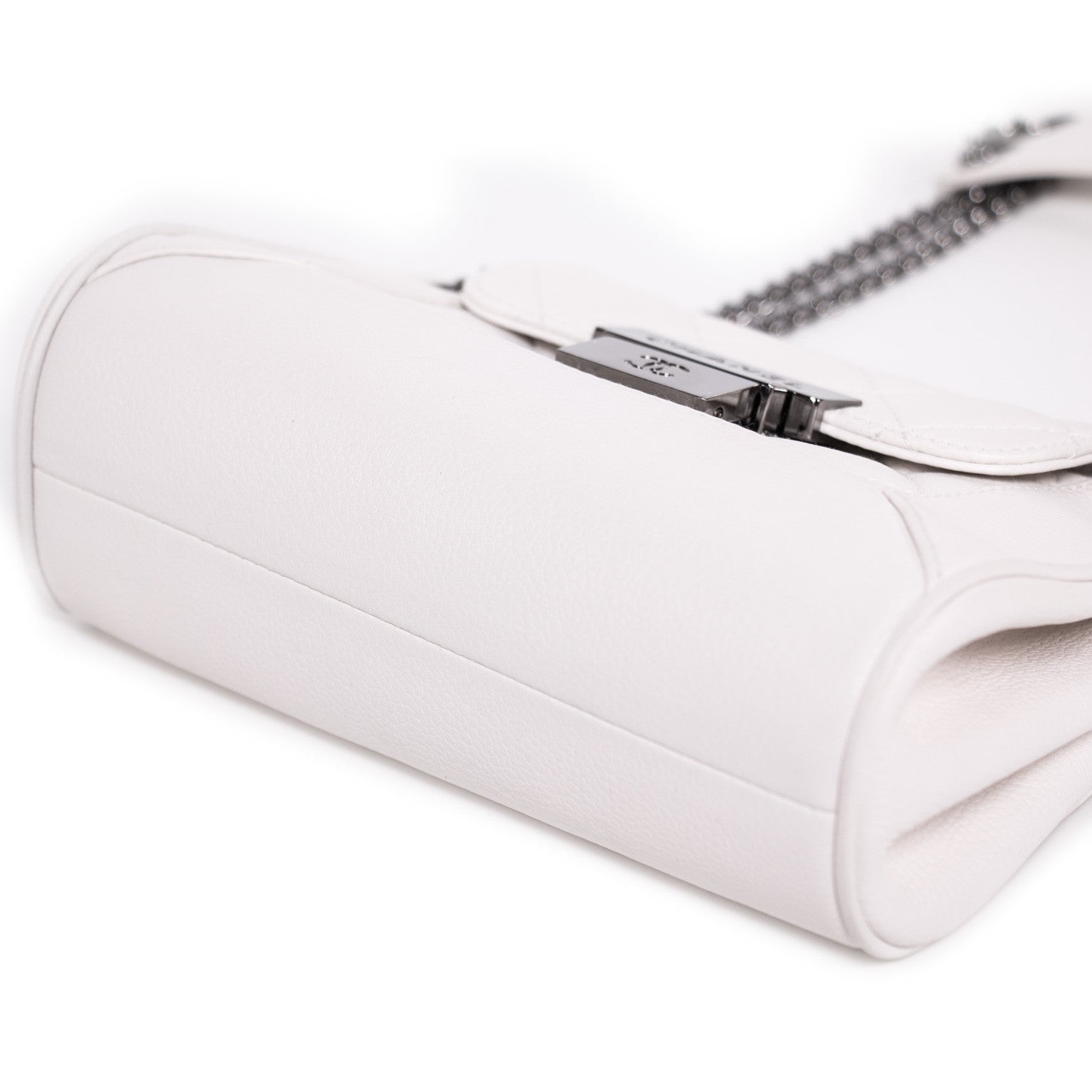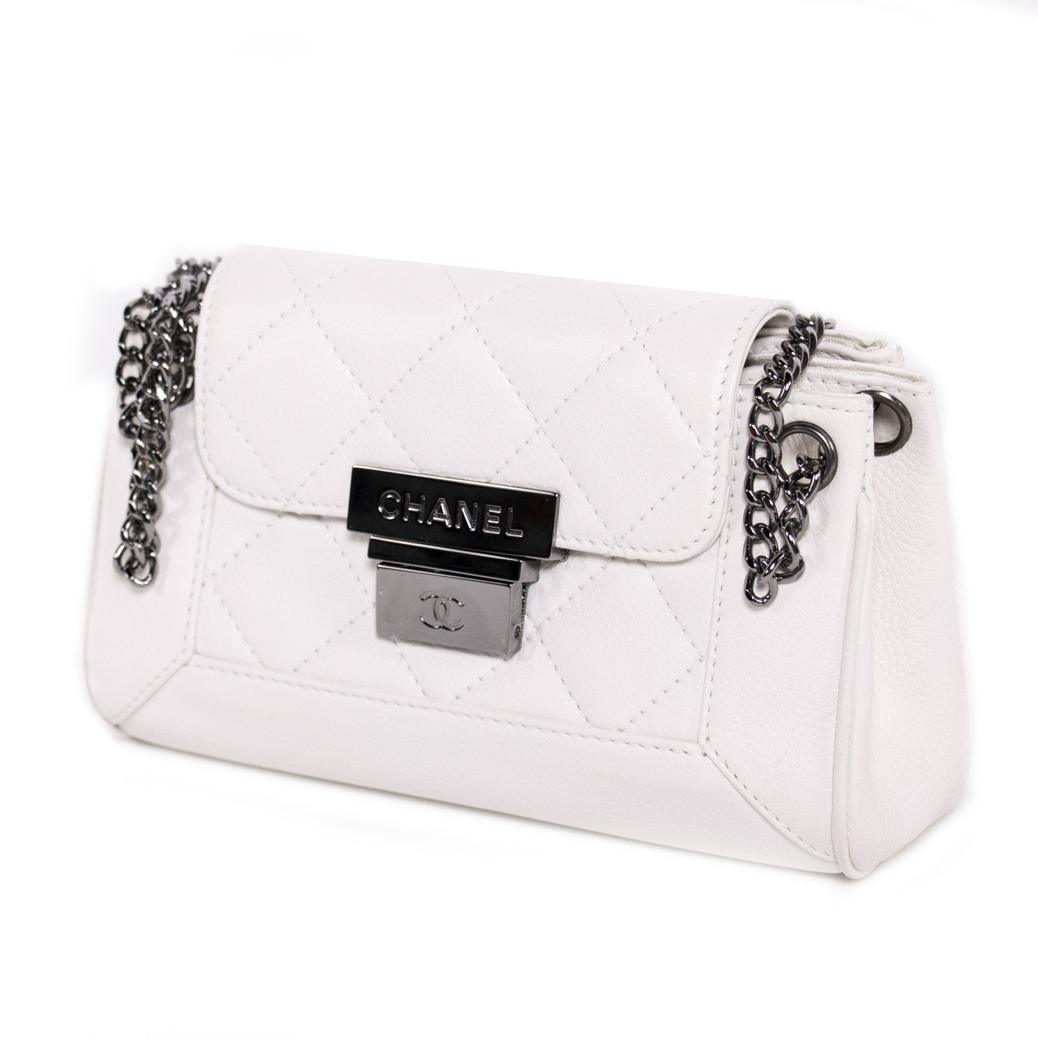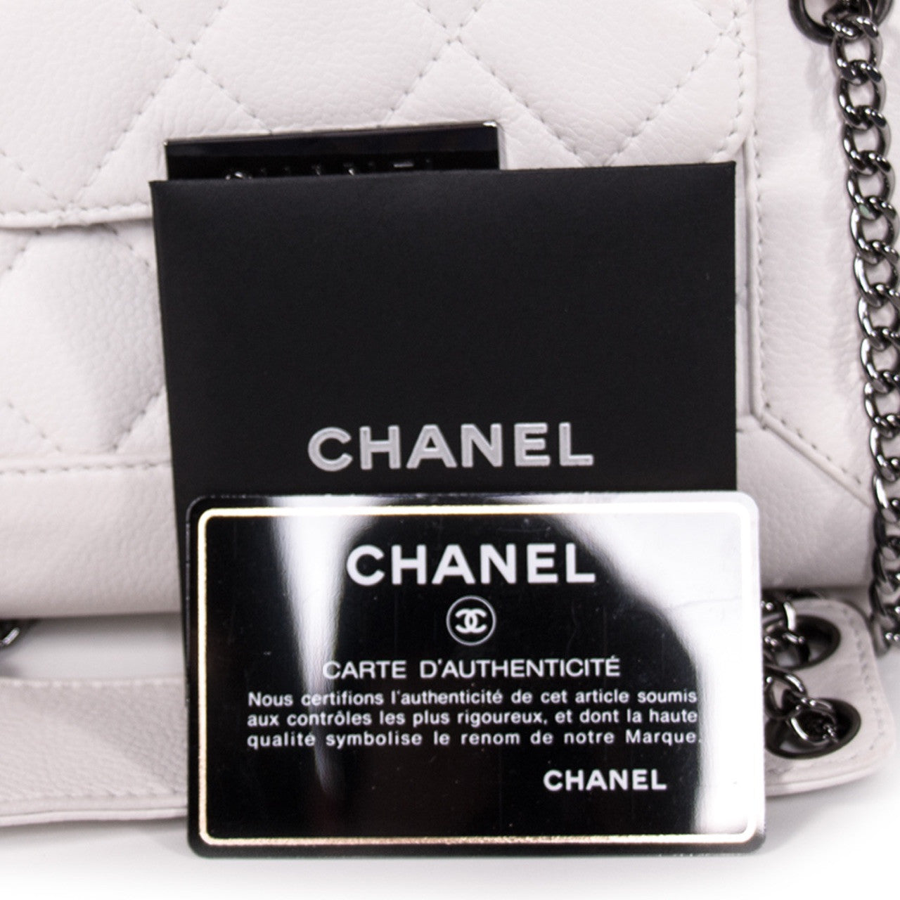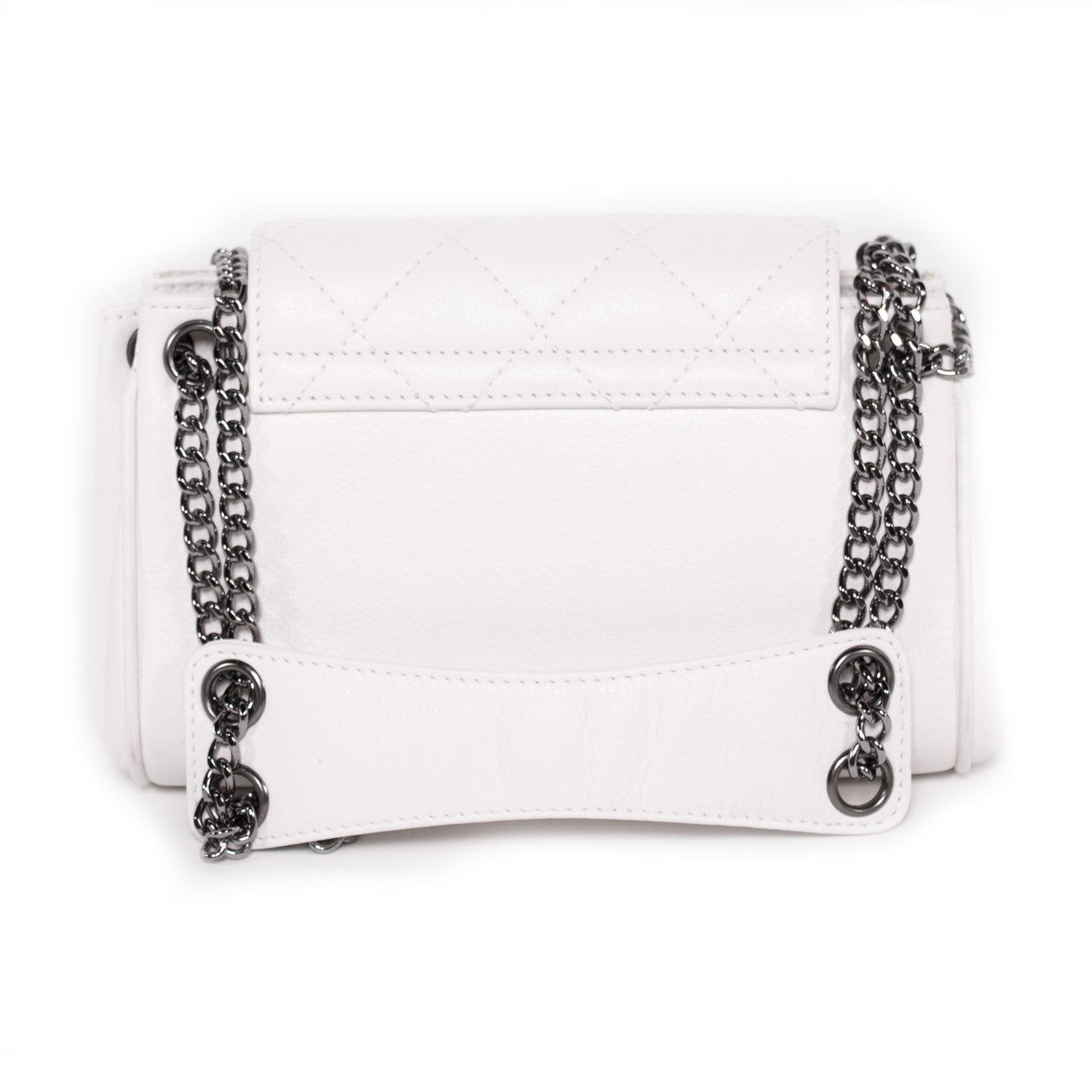 Details: White Caviar Leather / Gunmetal Hardware / Single Shoulder Strap With Double Chain-Link And Leather Accents / Quilted Leather At Flap And Front / Chanel Logo Printed Tonal Woven Interior Lining / Single Compartment With A Flat Pocket / Push-Lock Closure At Front