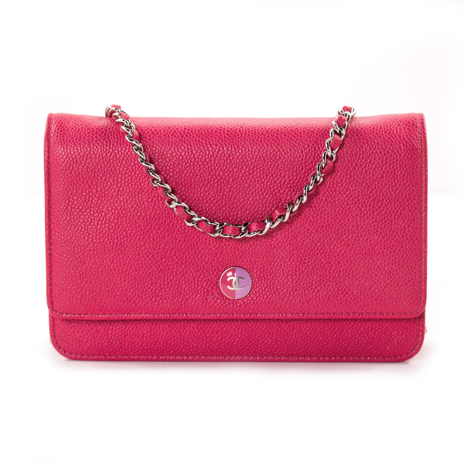 Details: Pink Caviar Grained Leather / Silver-Tone Hardware / Chain-Link Shoulder Strap With Pink Leather Accent / Interior Leather And Satin Lining / Single Compartment / Three Pockets At Interior, One With Zip Closure / Six Card Slots At Interior Wall / Zip Pocket Inside The Front Flap / Push Button Closure At Front Flap