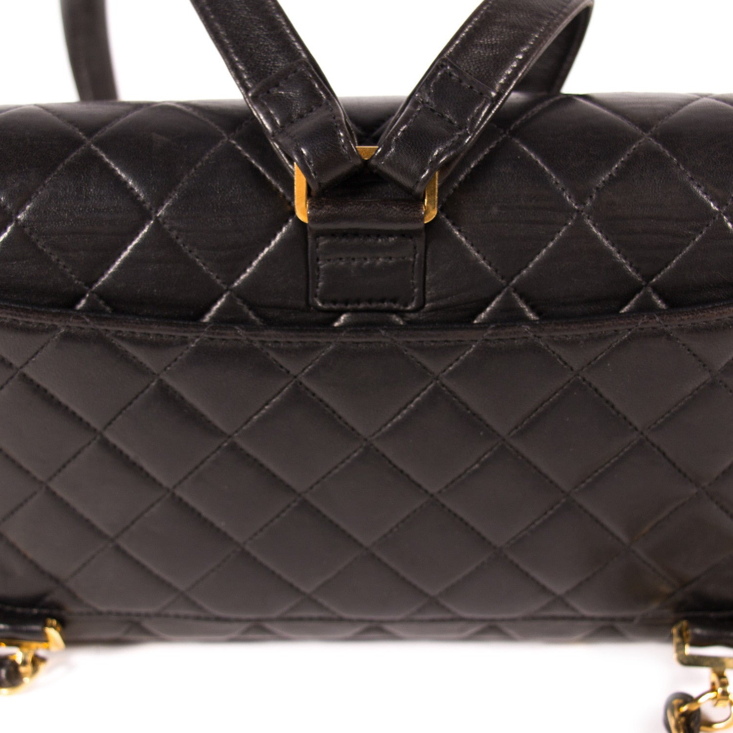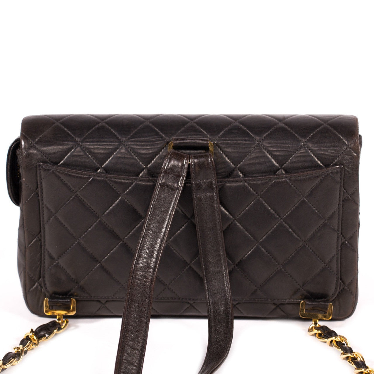 Details: Black Quilted Lambskin Leather / Gold Tone Hardware / Dual Shoulder Straps Featuring Chain-Links / Exterior Flat Pocket At Back / Black Leather Interior Lining / Dual Pockets At Interior Walls, One With Zip Closure / Zip Closure At Inside / Interlocking CC Turn-Lock Flap Closure