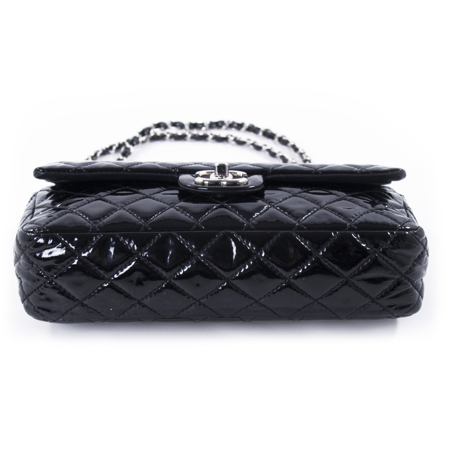 Details: Black Quilted Patent Leather / Silver-Tone Hardware / Dual Chain-Link Leather Shoulder Strap / Exterior Pocket at Back / Dual Compartments with Two Flat Pockets / Dual Flap Closure with Push-Button and Turn-Lock Closure