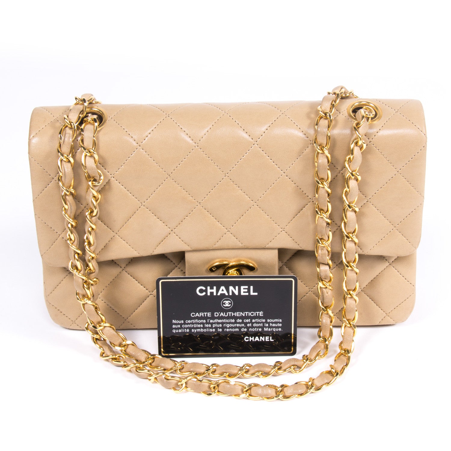 Details: Beige Quilted Lambskin Leather / Gold Tone Hardware / Dual Chain Link And Leather Shoulder Straps / Exterior Pocket At Back / Interior Beige Leather Lining / Zipper Pocket At Front Flap / Dual Interior Compartment / Double Slit Pockets At Interior Wall / Signature Logo Turn Lock At Front Flap