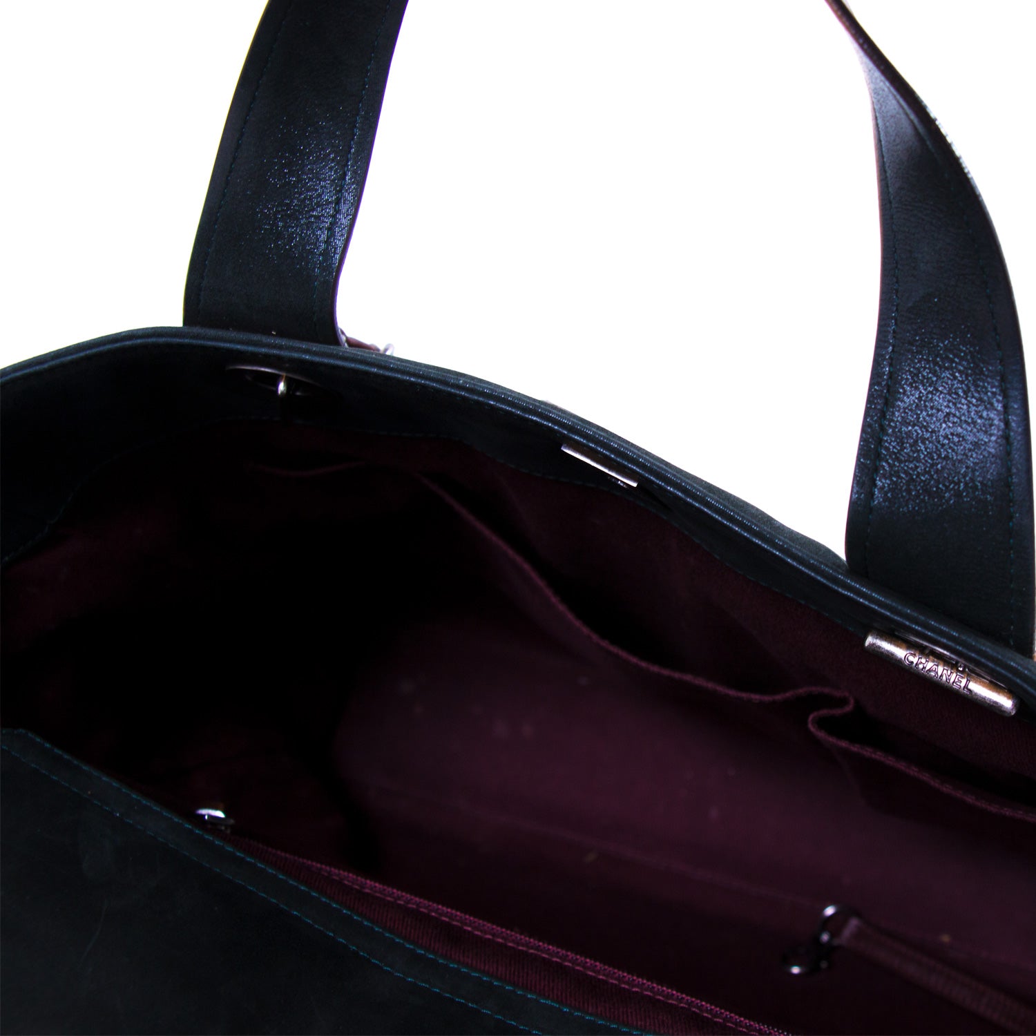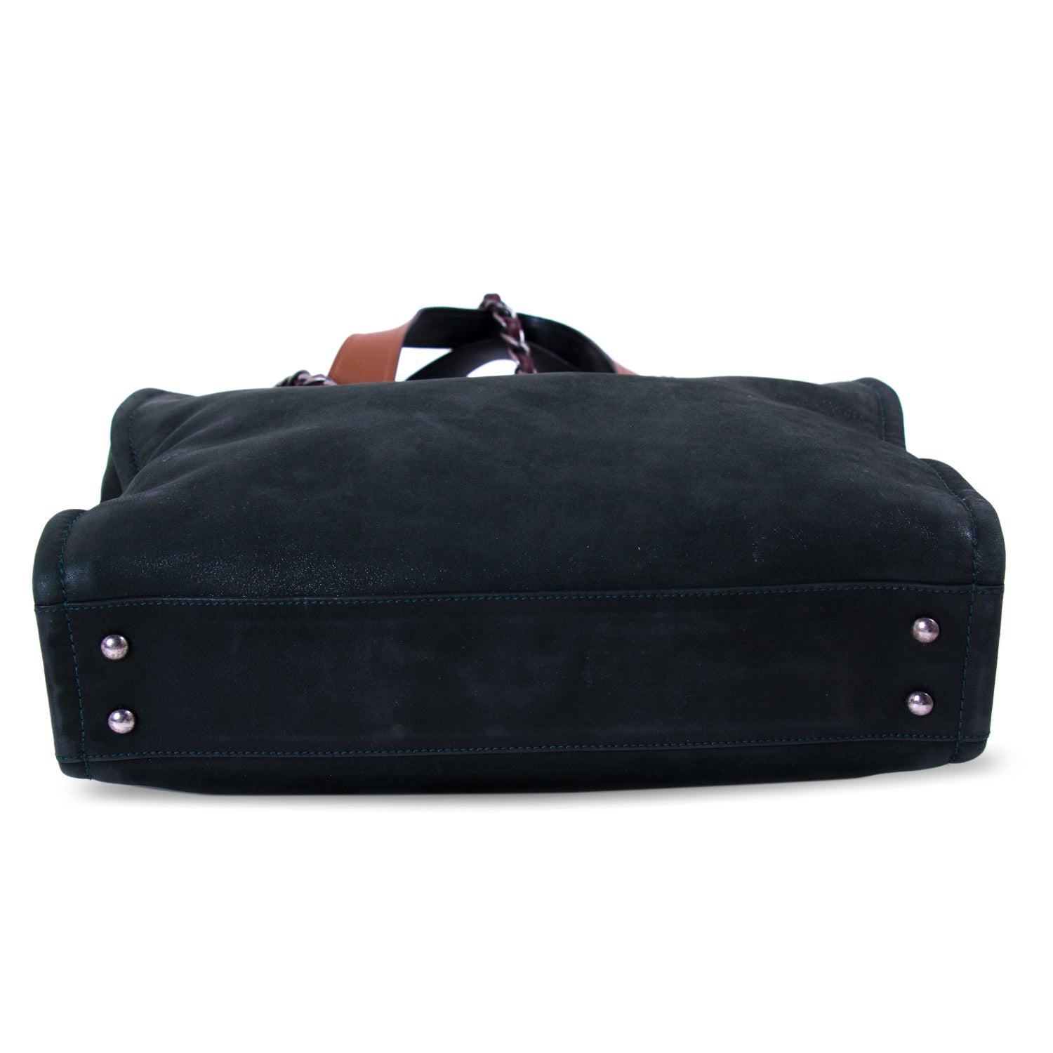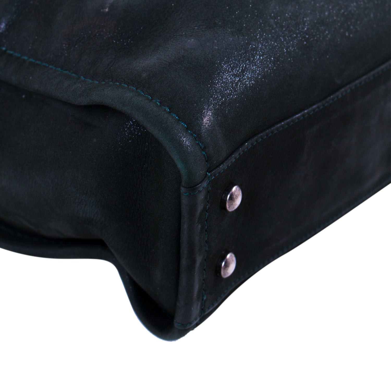 Details: Dark Green Iridescent Suede / Glazed Patent Calf Leather / Dual Brown Leather Handles / Dual Leather-Chain Shoulder Strap / Single Compartment with Dual Flat Pockets and One Zipper Pocket / Turn-Lock Closure at Flap