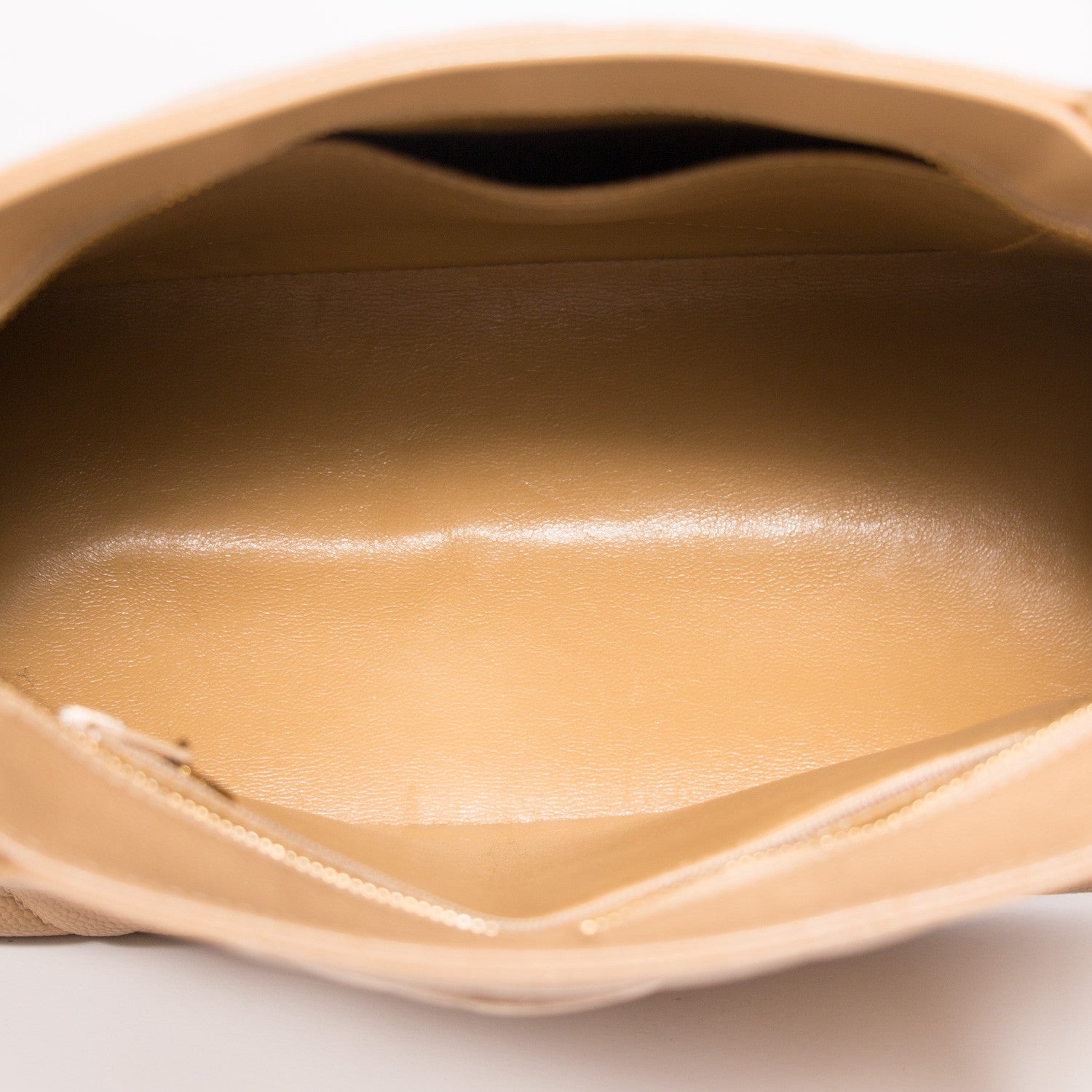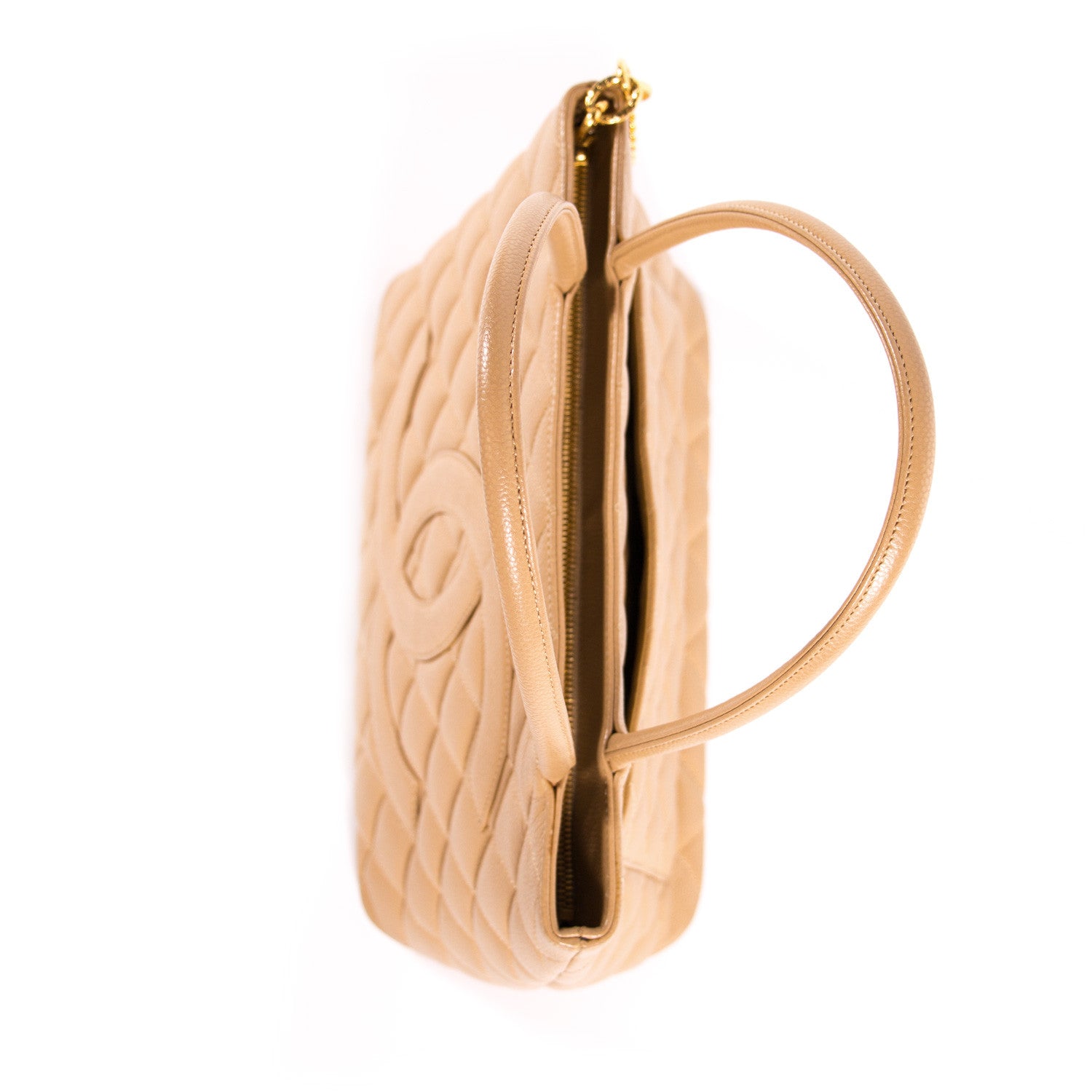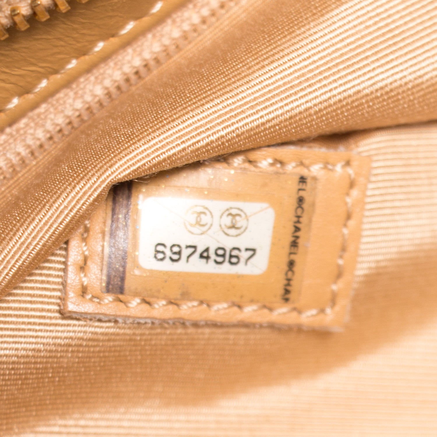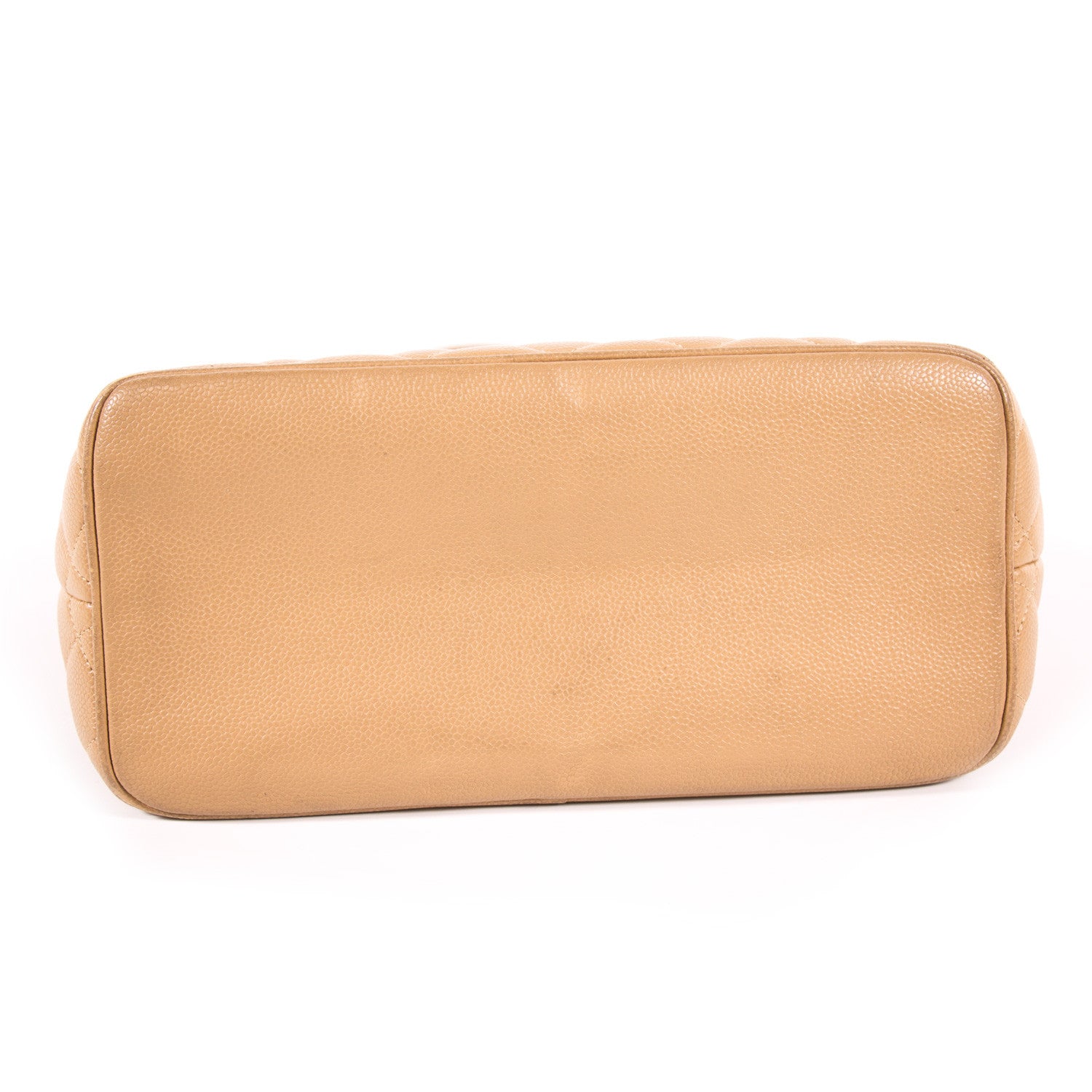 Details: Tan Quilted Caviar Leather / Gold Tone Hardware / Dual Rolled Handles / Exterior Flat Pocket At Back / Tonal Stitched CC Logo Embellishment At Front / Tonal Leather Interior Lining / Dual Pockets At Interior, One With Zip Closure / Zip Closure At Top
