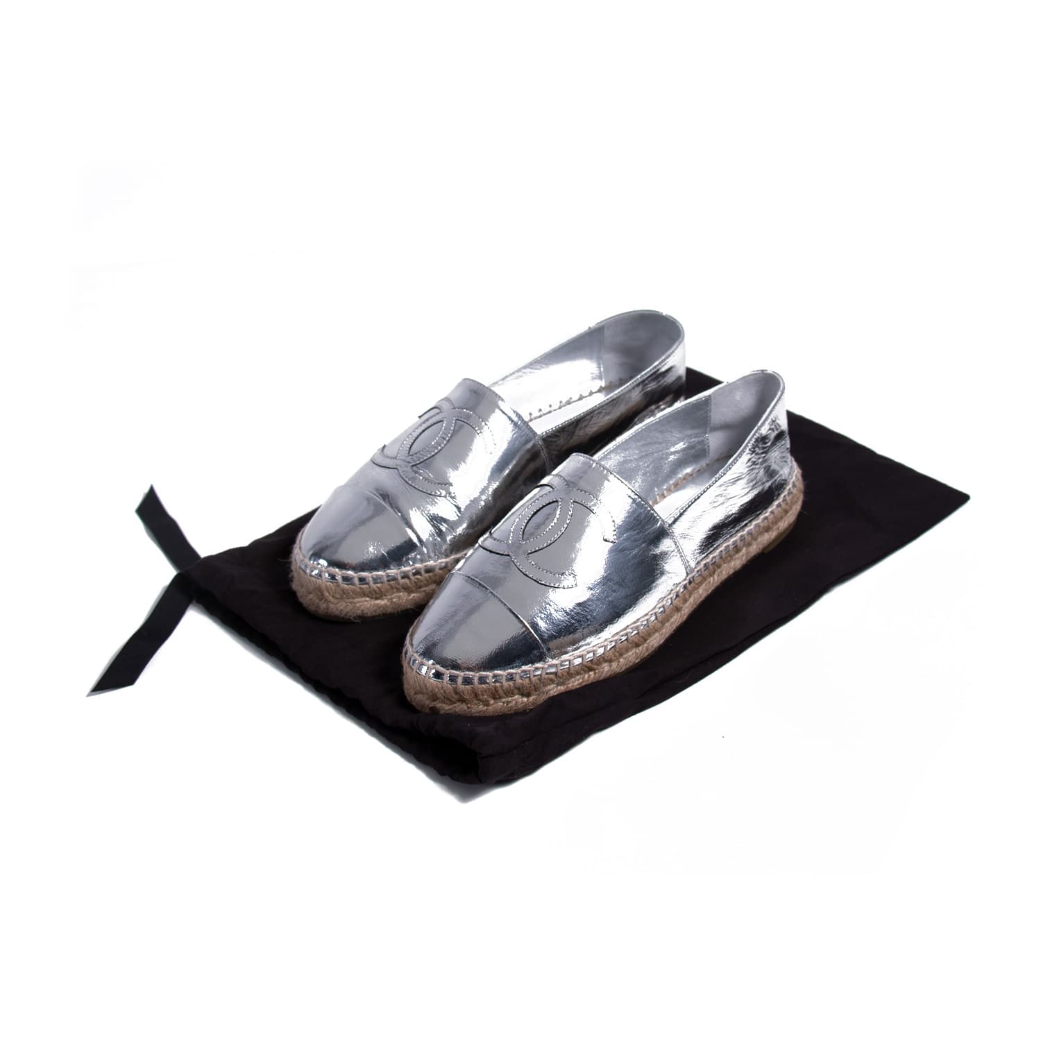 Details: Silver Metallic Leather / CC Logo at Vamps / Jute Trims / Rubber Sole