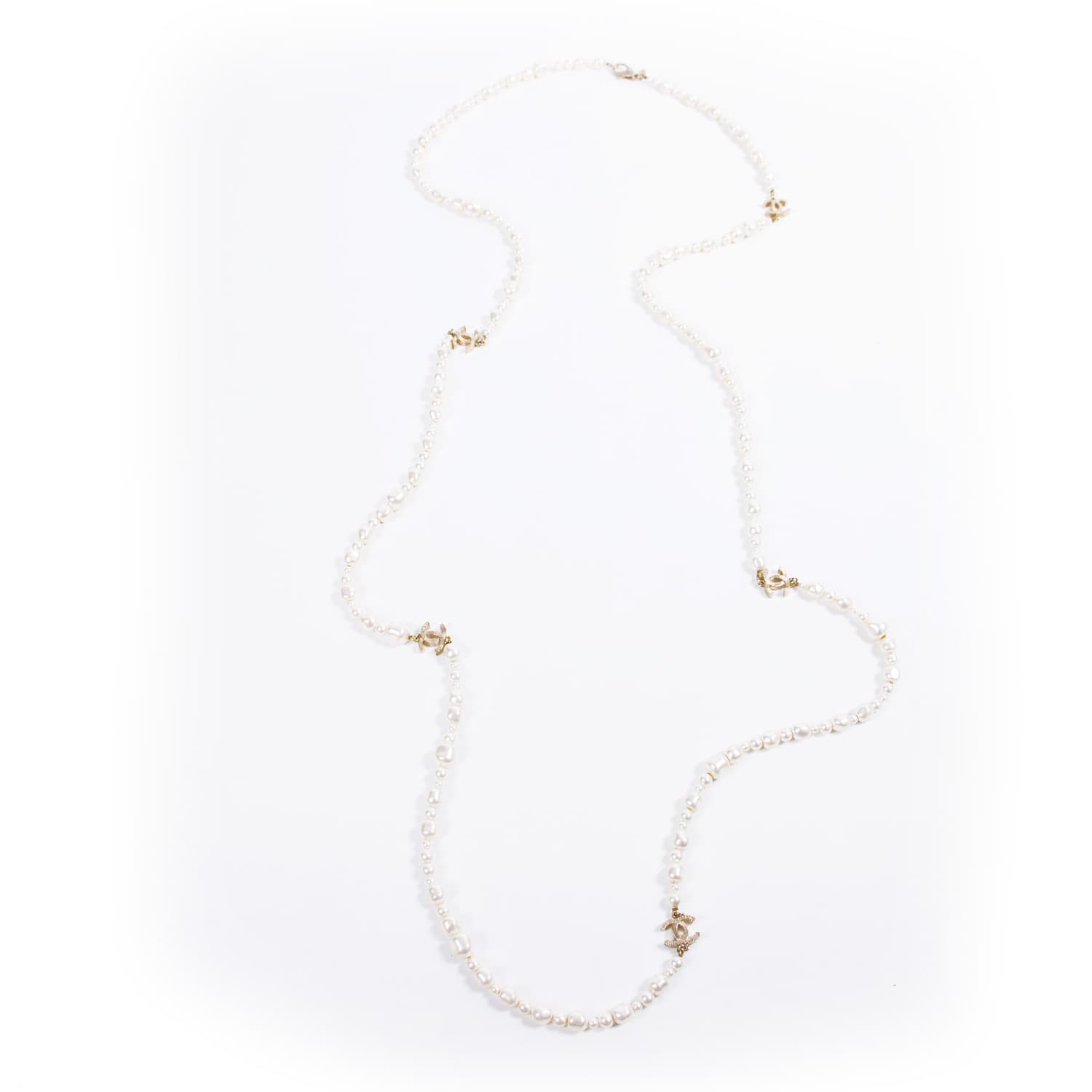Details: White Pearls / Gold-Tone Hardware / 5 Resin CC Logo Stations / Lobster Clasp Closure