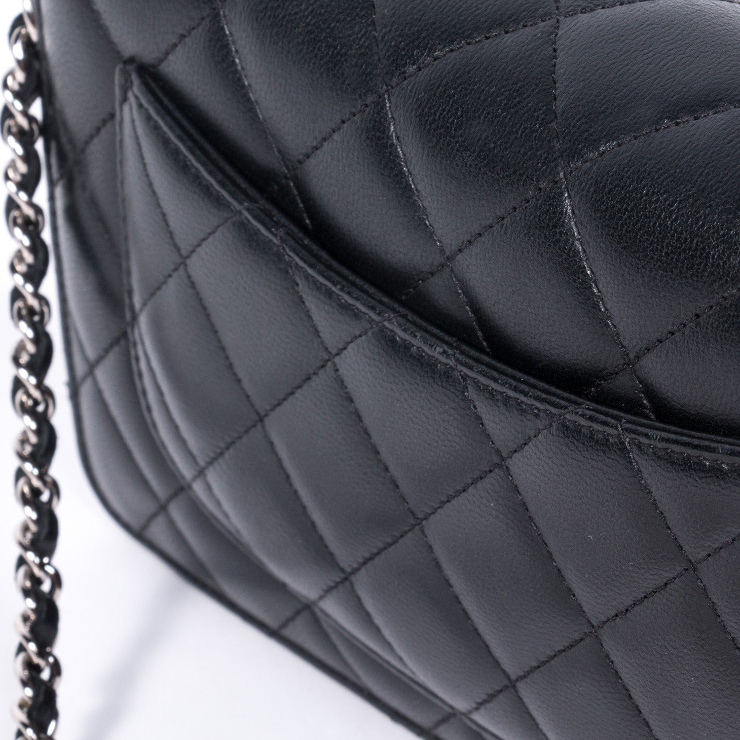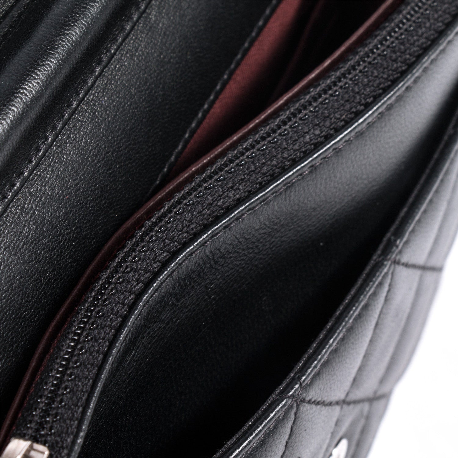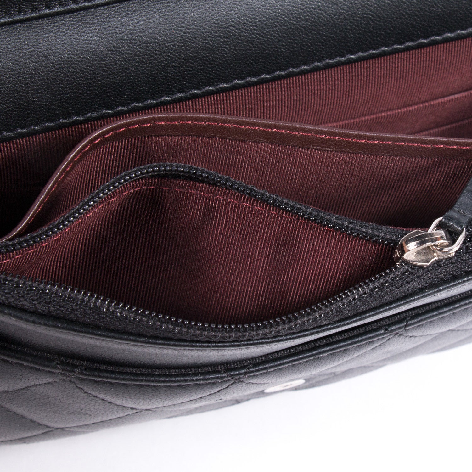 Details: Black Quilted Lambskin Leather / Silver Tone Hardware / Chain Link And Leather Shoulder Strap / Exterior Pocket At Back / Burgundy Grosgrain And Leather Interior / Six Card Slot At Interior / Three Interior Pockets / Two Zip Pockets / Snap Closure At Front