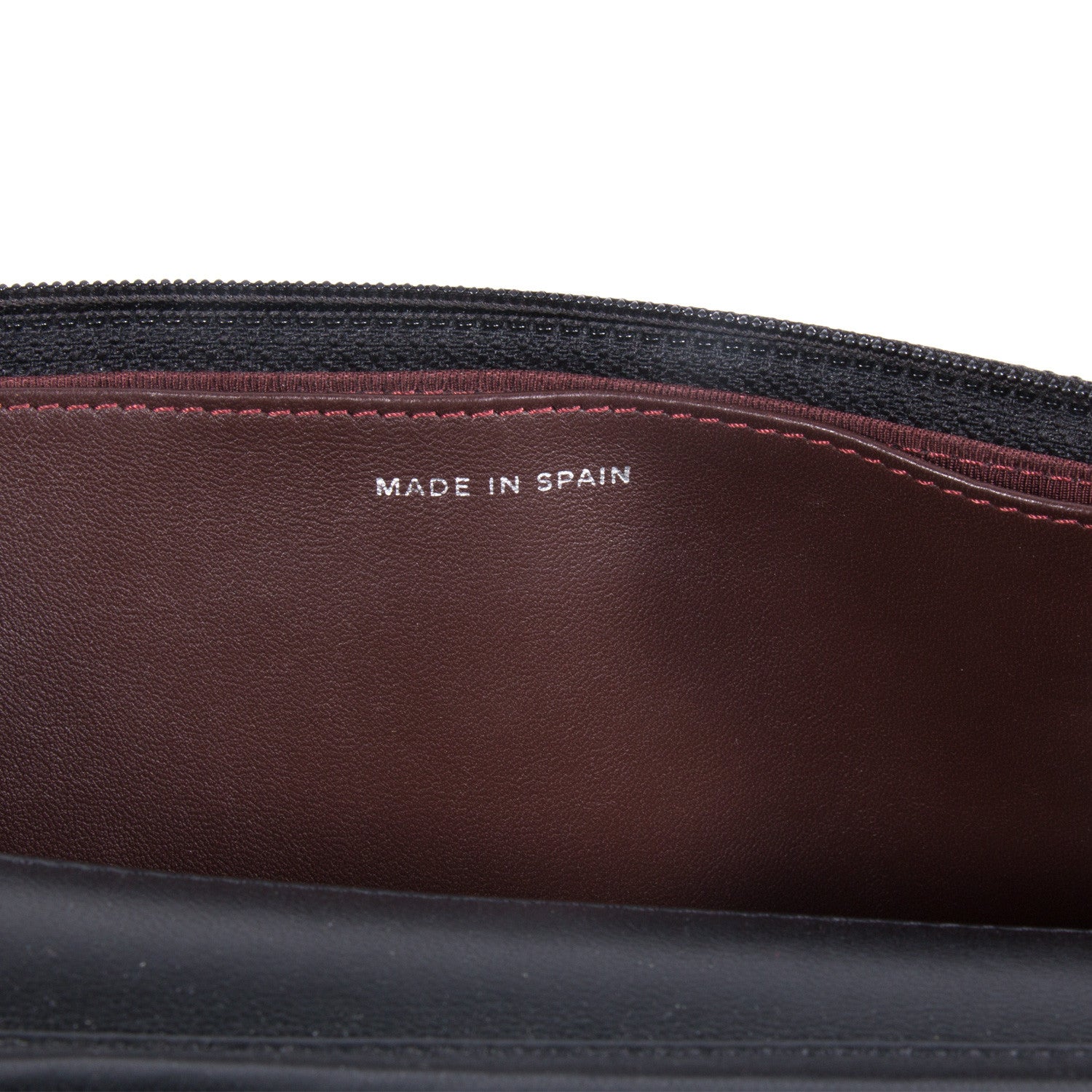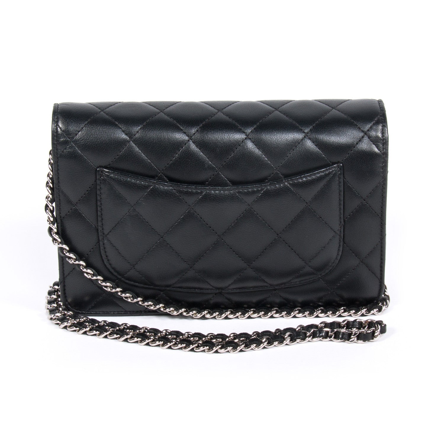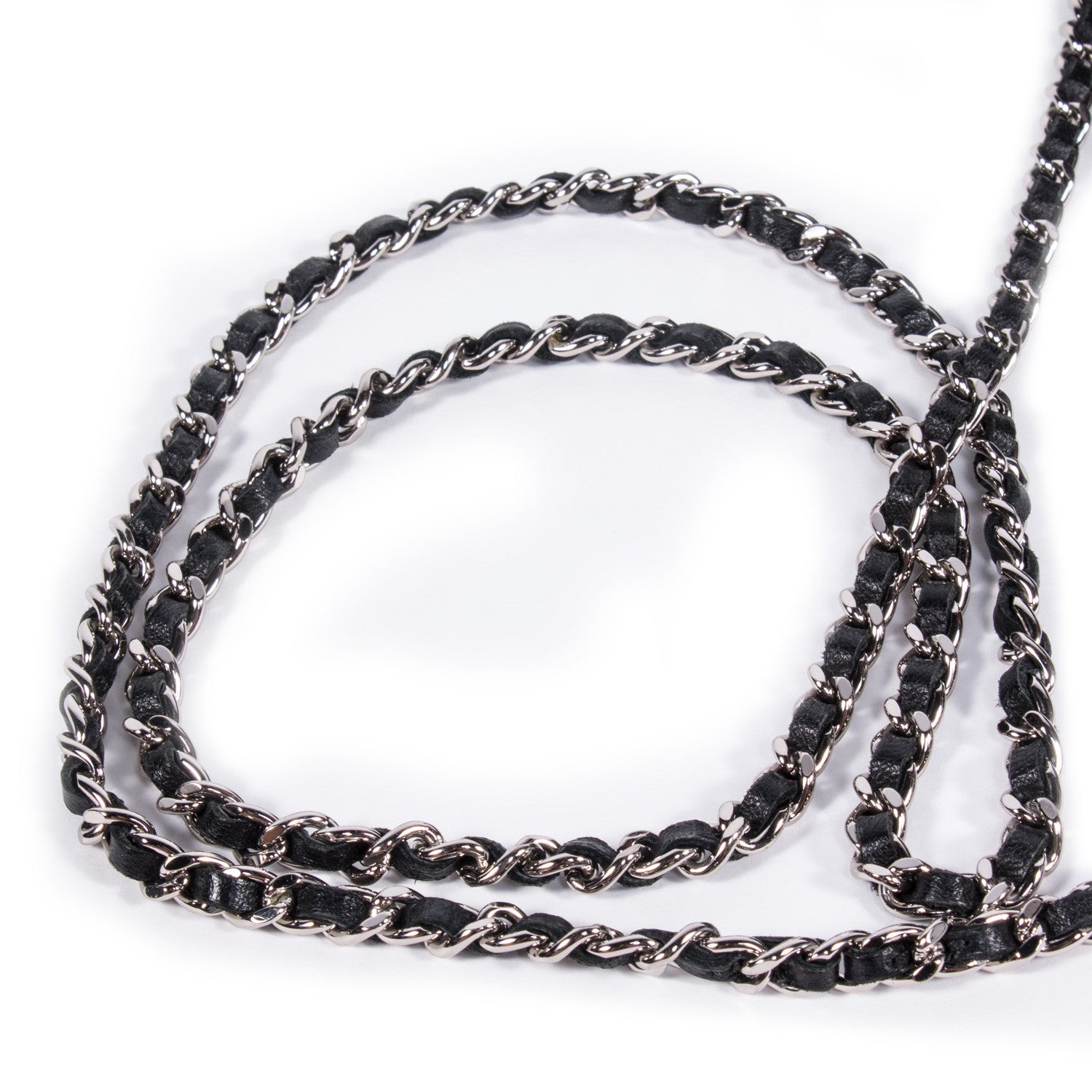 Details: Black Quilted Lambskin Leather / Silver Tone Hardware / Chain Link And Leather Shoulder Strap / Exterior Pocket At Back / Burgundy Grosgrain And Leather Interior / Six Card Slot At Interior / Three Interior Pockets / Two Zip Pockets / Snap Closure At Front