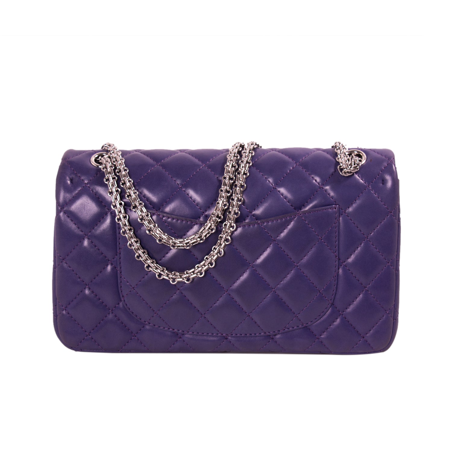 Details: Purple Quilted Leather / Silver-Tone Hardware / Chain-Link Shoulder Strap / Exterior Pocket at Back / Leather Lining / Dual Flat Pockets at Zipper Pocket at Insider Flap / Dual Flap with Button and Turn-Lock Closure